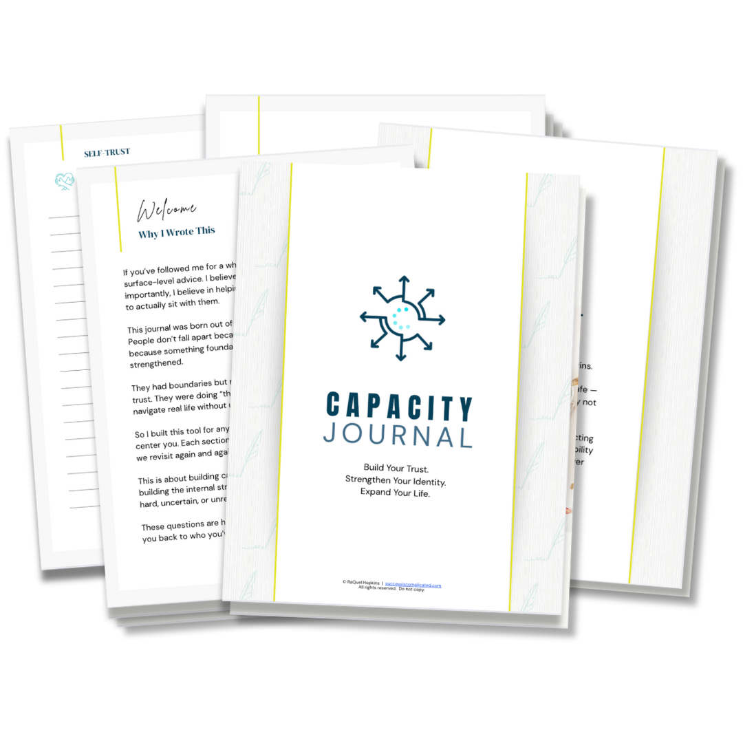 The Capacity Journal is 90+ pages of guided prompts designed by a licensed therapist and coach to help you rebuild trust in yourself, find clarity under pressure, and expand how you move through life.